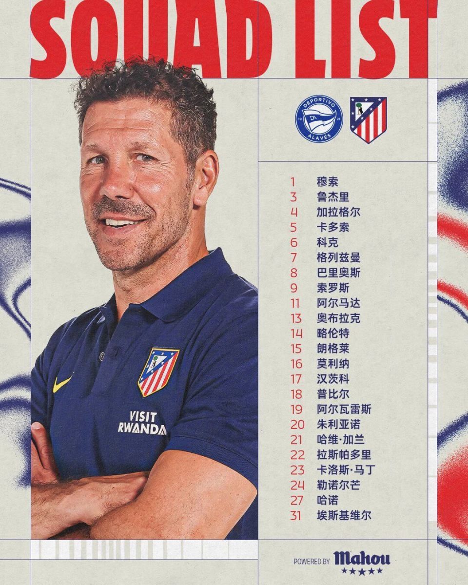 马竞赛前公布了前往客场的球员大名单,吉梅内斯与巴埃纳将继续因伤缺席。